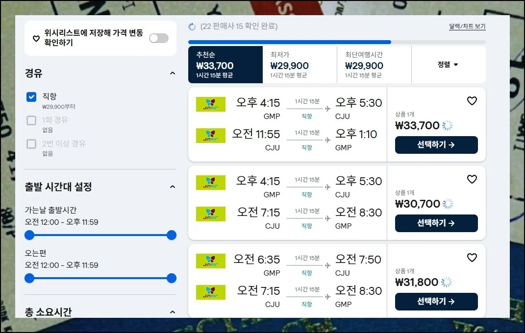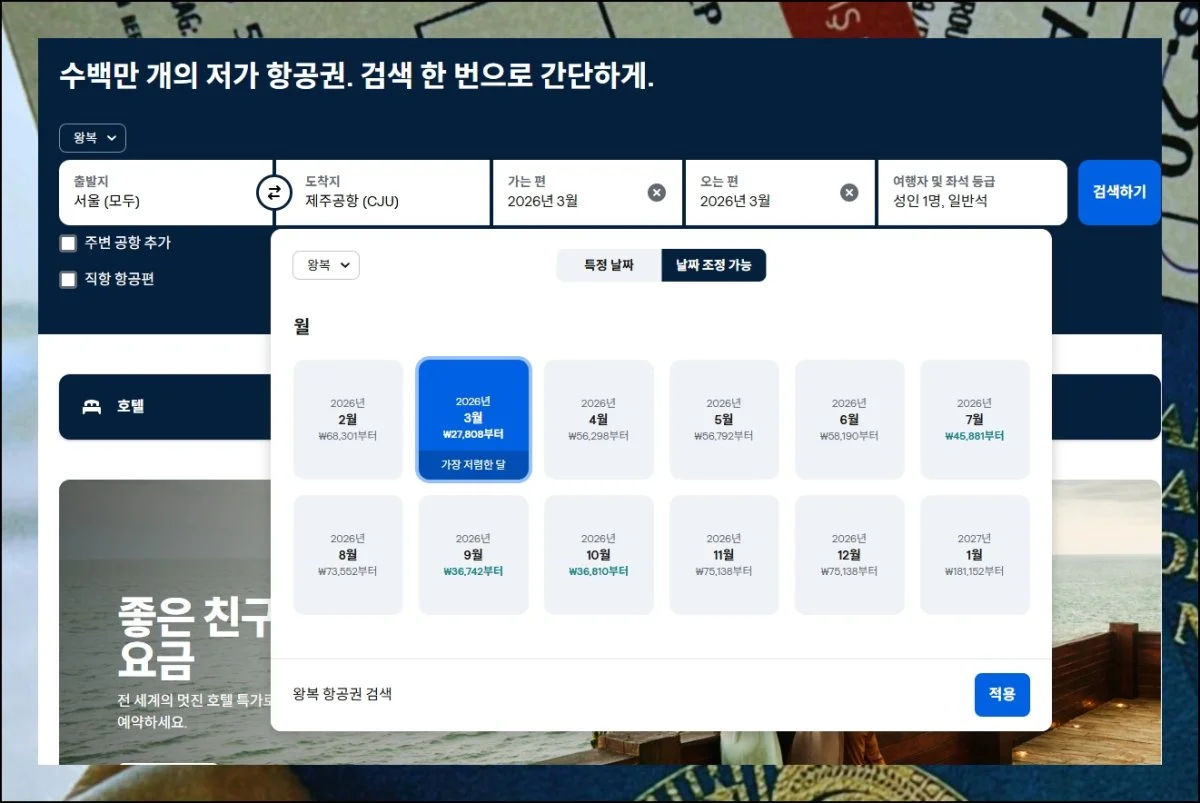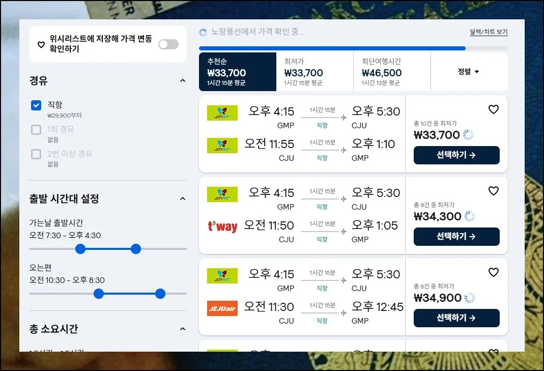 도착지를 제주로 잡고 경유 없는 직항 조건만 체크한 뒤 바로 조회를 실행해 보세요. 유연한 일정이 곧 절약의 열쇠가 돼요.