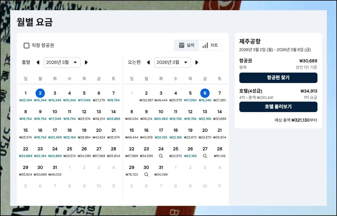 요금 목록에서 가장 낮은 숫자가 붙은 날을 세심하게 살펴보세요. 출발 일자를 하루 이틀만 옮겨도 예상 밖으로 파격적인 제주항공권 가격이 뜹니다.