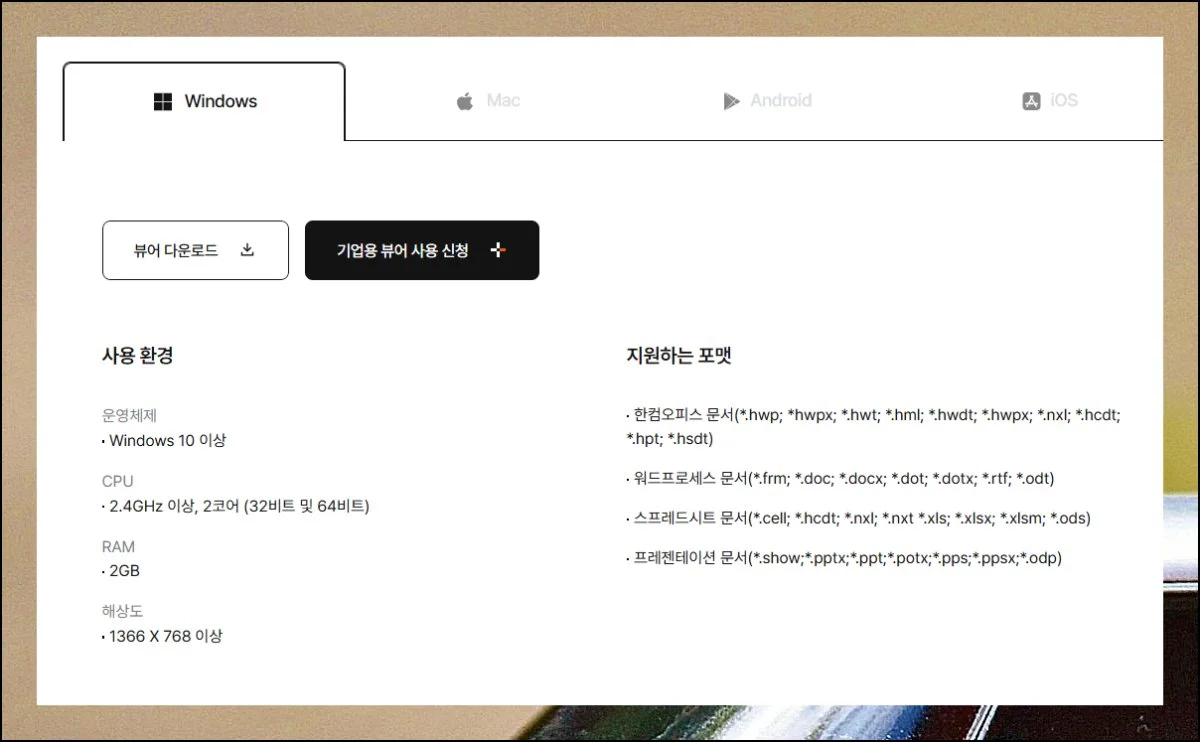 한글과 컴퓨터 공식 웹사이트에서 뷰어를 간편하게 다운받을 수 있어요. 용량이 작아서 설치 시간이 오래 걸리지 않습니다.