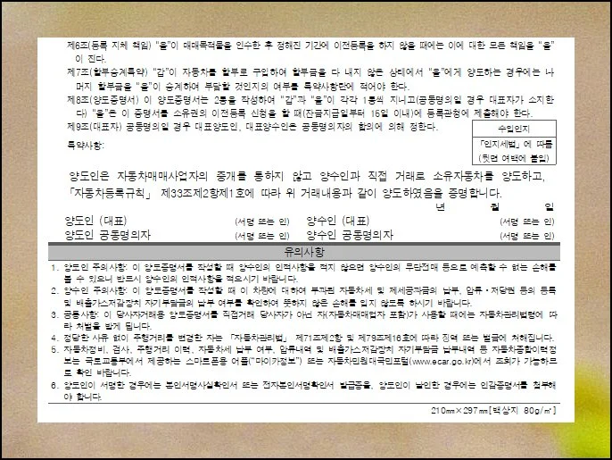 유의사항 부분을 읽어보면 주의할 점과 특정 케이스에서 추가로 준비해야 하는 서류를 확인할 수 있어요. 모든 조항은 판매자와 구매자 모두를 보호하기 위해 마련된 것이니 하나씩 천천히 읽으면서 진행하는 게 좋습니다.