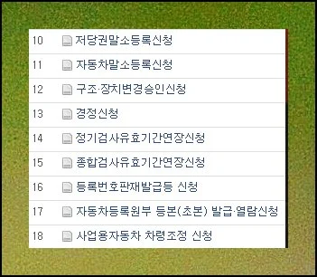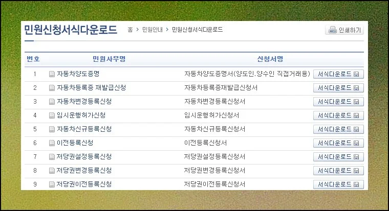 저당권 말소, 정기검사 유효기간 연장 등 다양한 경우에 필요한 양식도 마련되어 있어요. 차량 소유에 관련된 대부분의 행정 절차 서류를 이곳에서 한꺼번에 구할 수 있습니다.