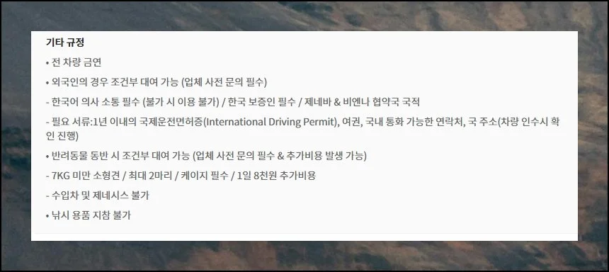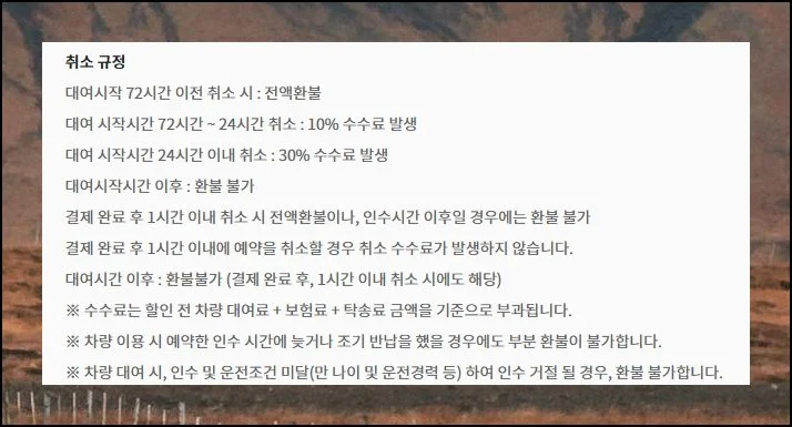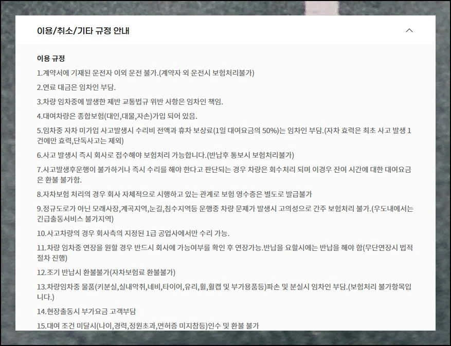 렌트 업체 직원들이 보통 안내해주는 중요한 내용들이 구매 페이지에 자세히 기재되어 있습니다. 성수기에는 별도의 할증료가 적용된다고 명시되어 있으니 예약을 완료한 후에도 차량 인수 전에 한 번 더 업체에 연락해서 확인해보시는 것이 좋겠어요.