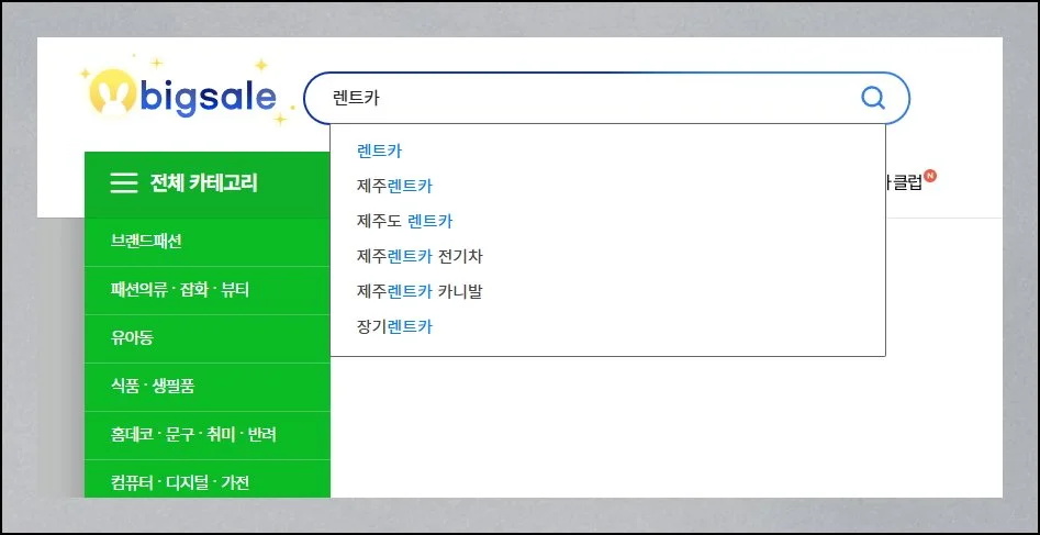 지마켓 메인 페이지에 접속하신 후 상단 검색창을 찾아보세요. 렌트카라는 키워드를 입력하고 검색 버튼을 클릭하시면 됩니다.
