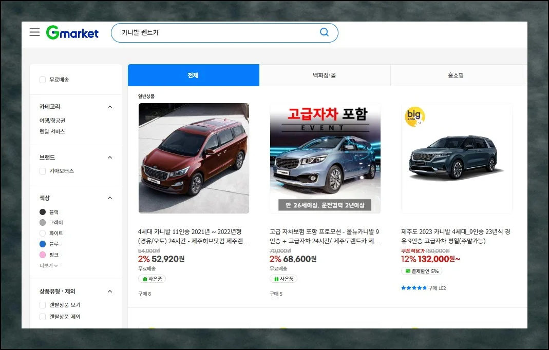 일반적으로 쇼핑 사이트로만 알려져 있지만 차량 대여 예약 서비스도 상당히 경쟁력 있는 가격으로 제공하고 있어요.