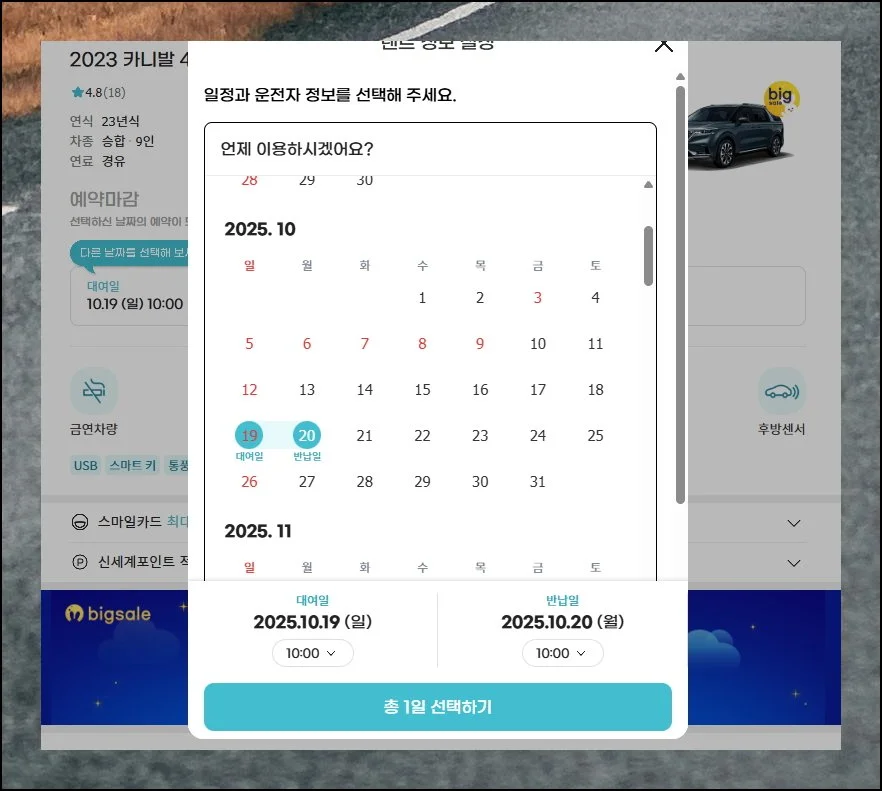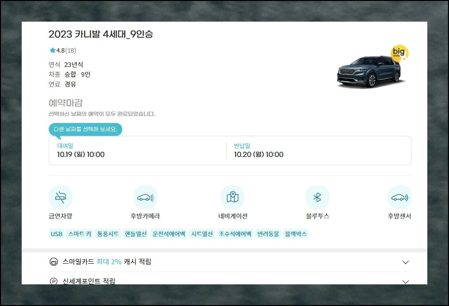선택한 업체의 상품 페이지에서 세부 옵션들을 설정해보도록 하겠어요. 카니발 외에도 싼타페, 스포티지, 티볼리 등 여러 차종 중에서 선택할 수 있게 되어 있는데요.