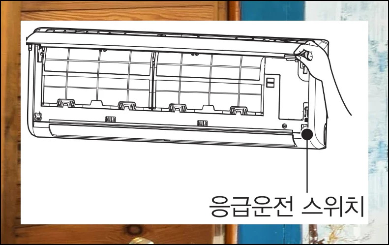 벽걸이형 에어컨에는 숨겨진 응급 운전 기능이 있습니다. 리모컨 없을때 본체의 앞쪽 패널을 조심스럽게 열어보면 오른쪽 아래 구석에 작은 버튼이 하나 존재하는데요.