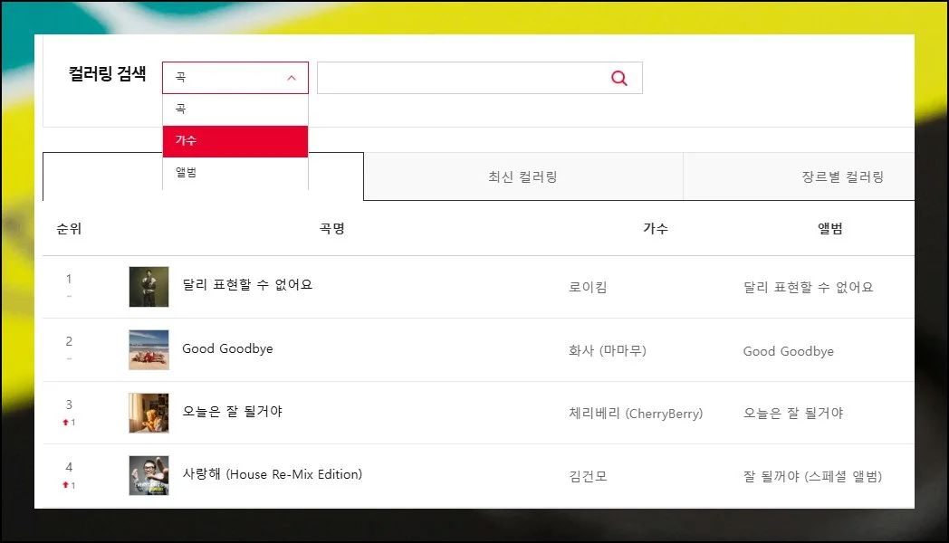컬러링 전용 화면이 열렸나요? 인기곡과 최신 음원을 바로 확인할 수 있어요.