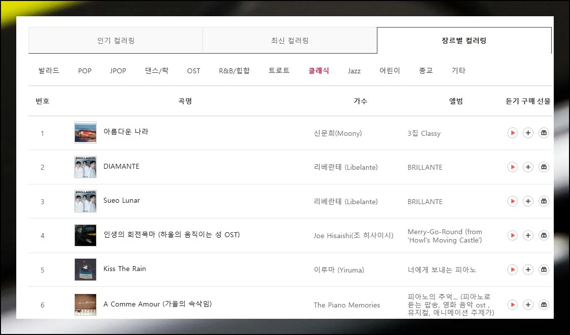 발라드, POP, 댄스, 락 같은 기본 장르가 있어요. OST, 트로트, 클래식까지 폭넓게 준비되어 있죠.