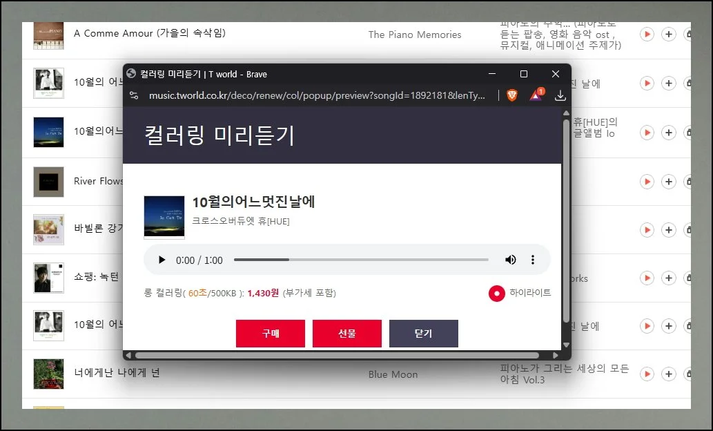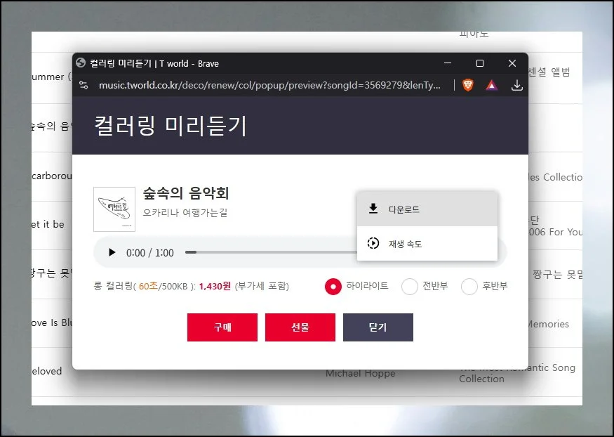 그럼 컬러링 음원 무료다운받는곳에 대해 알려드리겠습니다. 미리듣기 창을 자세히 보세요.