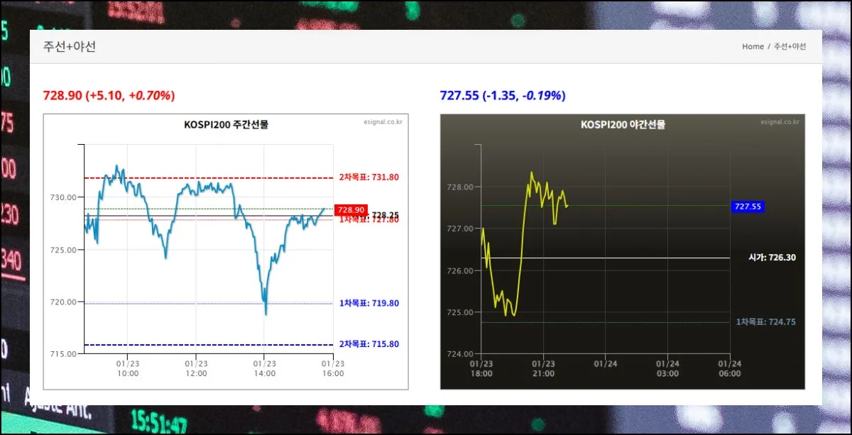 낮 시간대와 밤 시간대 코스피200 흐름을 차트 형태로 대조해볼 수 있습니다. 그래픽으로 표현되어 있어서 방향성 파악이 수월하죠.