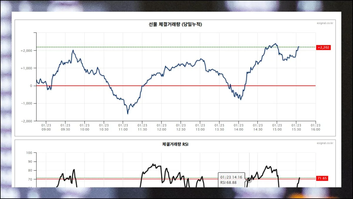 거래량 체결 누적 차트도 제공하고 있어요. 지수가 상승하는 구간에서는 적극적인 매수 주문이 많이 들어왔다는 걸 의미합니다.