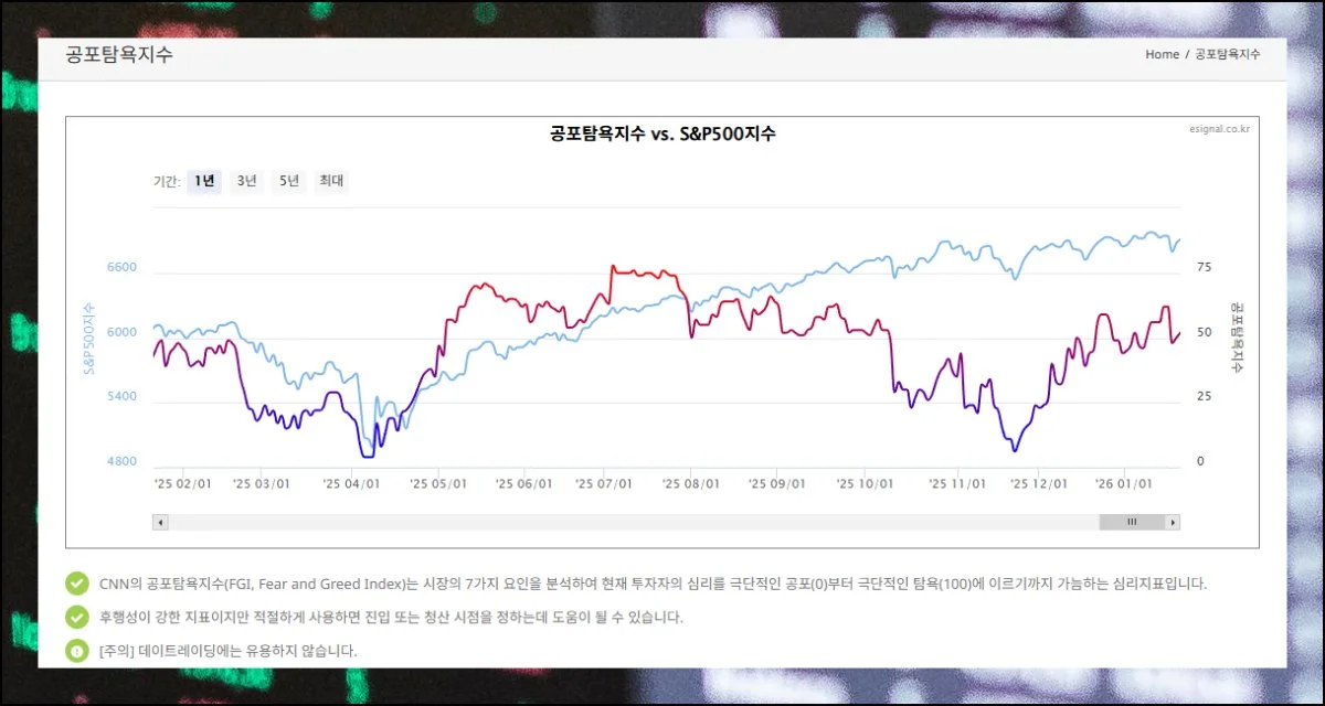 글로벌 주식시장 전체 분위기를 알아보고 싶으실 때는 CNN 공포탐욕지수를 확인해보세요. S&P500 차트와 같이 표시되어 있습니다.