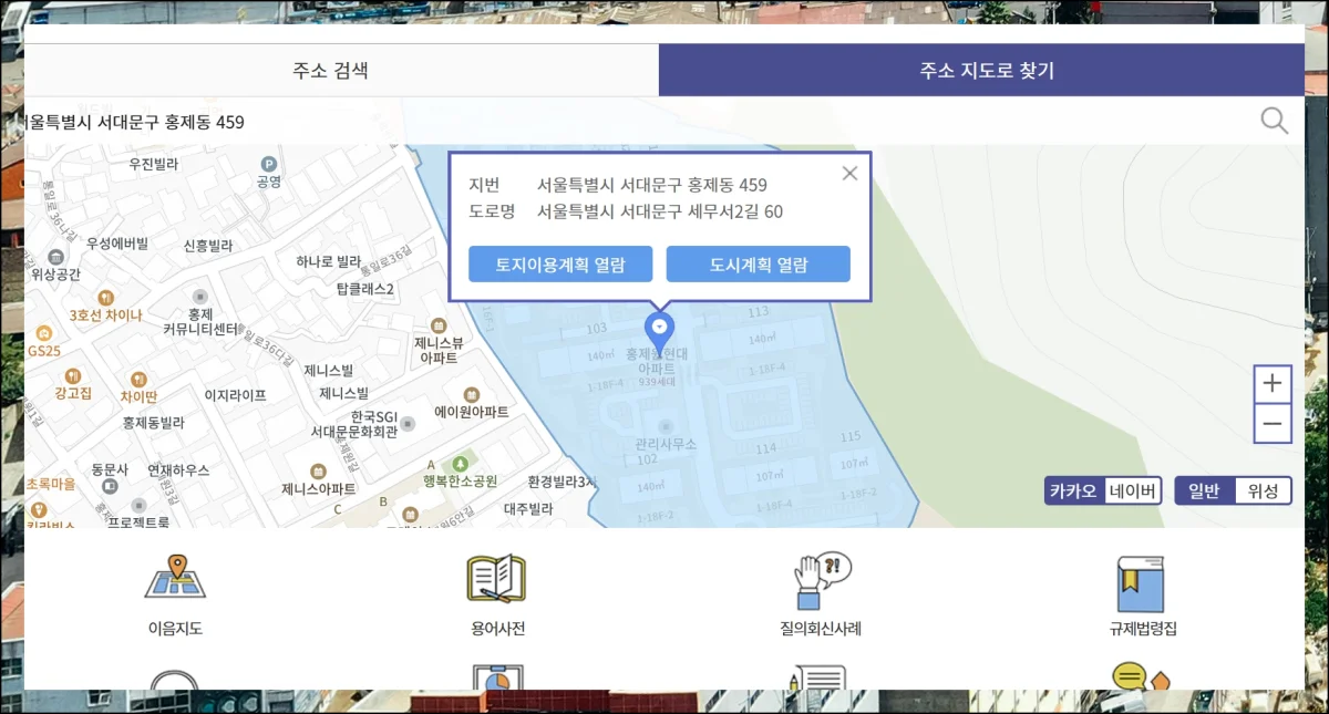 참고로 도시계획 열람도 가능합니다. 사용자 편의를 고려해 직관적으로 만들어졌기 때문에 처음 사용하시는 분도 어렵지 않게 조작할 수 있어요.