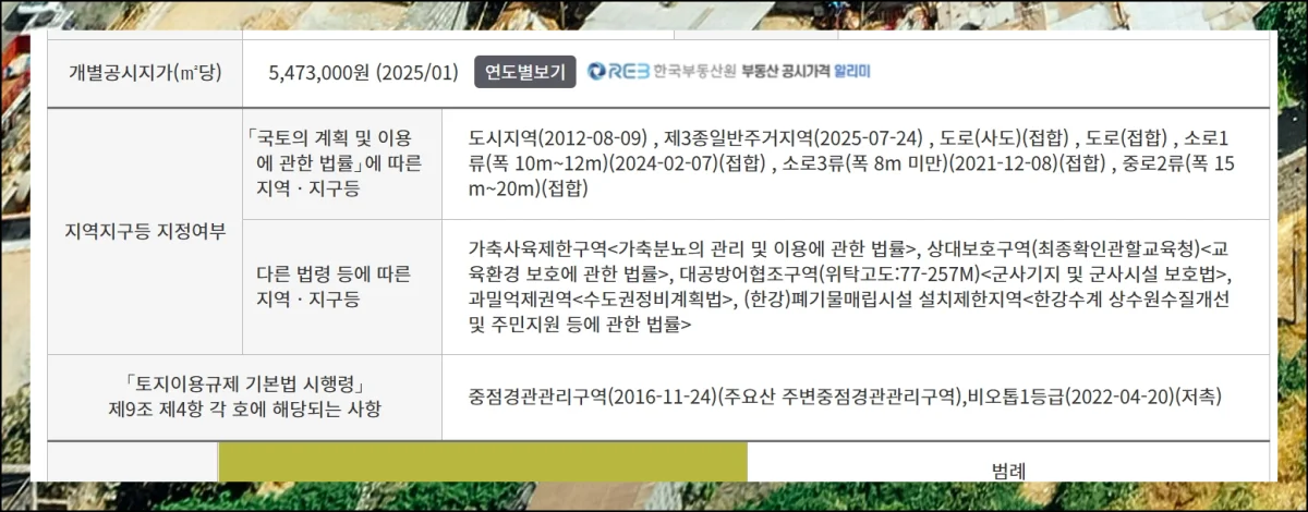 해당 토지에 적용되는 각종 규제 사항도 포함되어 있어요. 처음엔 간단히 표시되지만 클릭하면 상세 내용을 볼 수 있습니다.