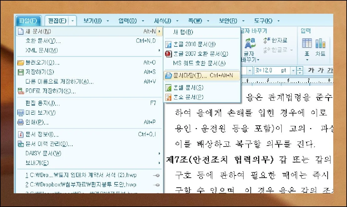 프로그램 실행 후 새 문서 메뉴로 들어가세요. 그다음 문서 마당을 차례대로 눌러주시면 됩니다.