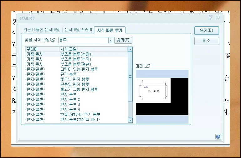 서식 파일 찾기를 클릭하면 놀라운 세계가 펼쳐져요. 제가 올린 기본 도안은 물론이고 특별한 상황에 활용할 수 있는 편지봉투가 가득합니다.