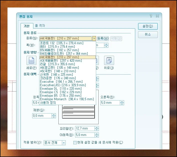 이미 사놓은 편지봉투에 바로 찍어내는 방식도 있어요. 편집 용지 버튼을 찾아 클릭하세요.