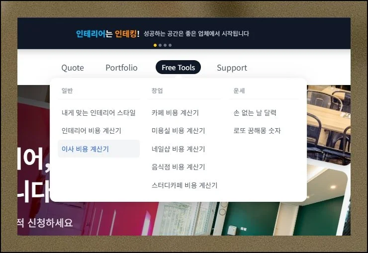 첫 화면에서 무료 도구 메뉴에 마우스를 올려보면 이사 비용 계산기가 눈에 들어옵니다.