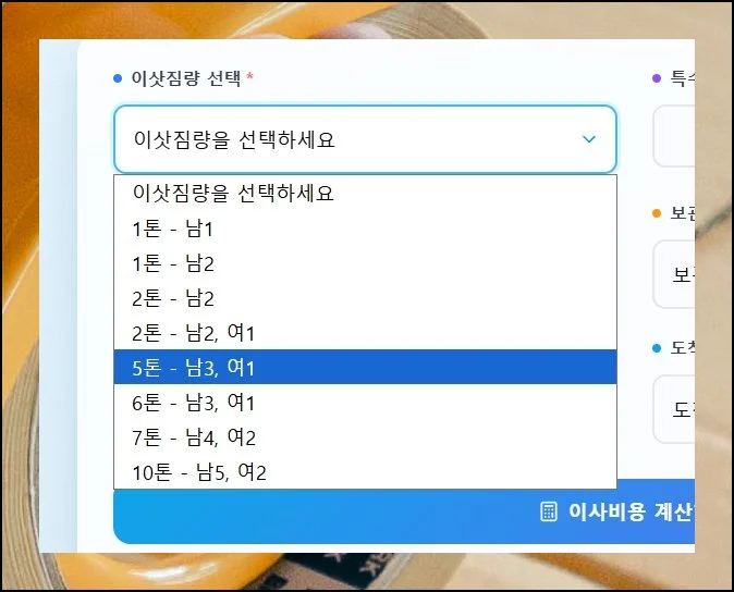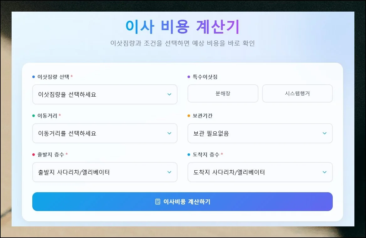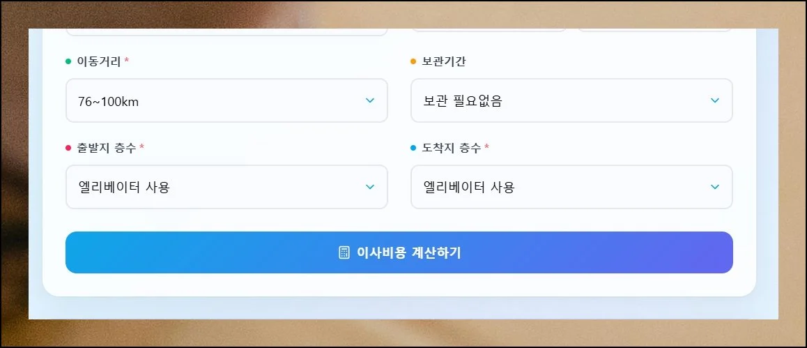 항목을 꼼꼼히 채울수록 견적 결과의 신뢰도가 올라갑니다. 전부 마무리했으면 이사비용 계산하기 버튼을 탭해 주세요.