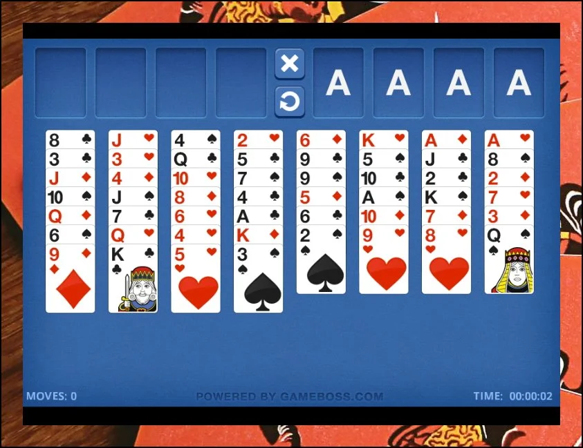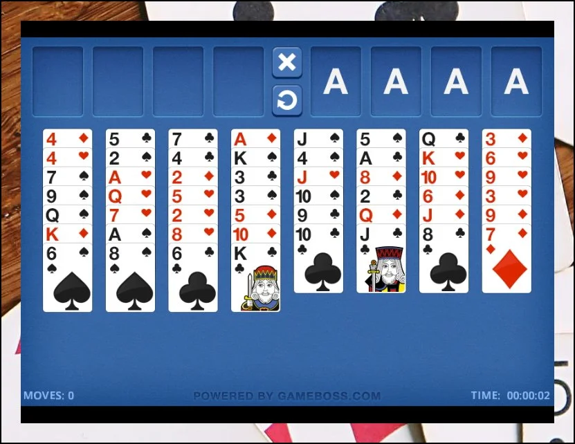 52장 트럼프를 8개 열로 나눠서 배치한 상태로 시작해요. 각 무늬마다 A부터 K까지 순서대로 완성하는 게 최종 목표입니다.