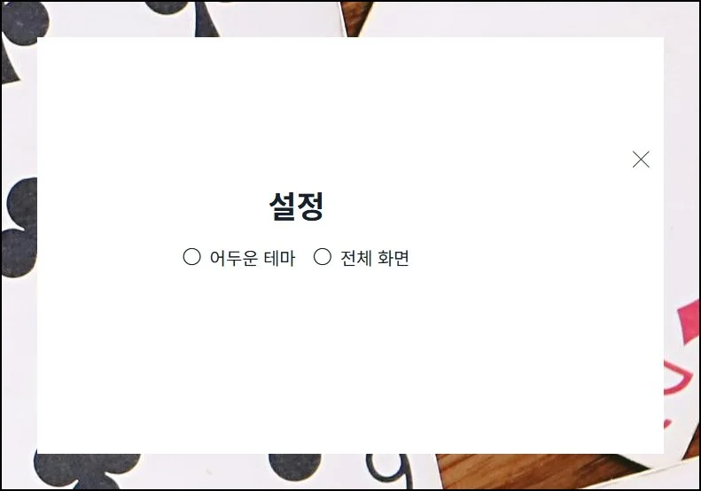 디스플레이 윗부분에 있는 설정 메뉴를 활용하면 다크 모드를 켜거나 전체 화면으로 바꿀 수 있어요. 자기 스타일에 맞게 조정해서 더 쾌적한 환경에서 카드게임을 즐겨보세요.