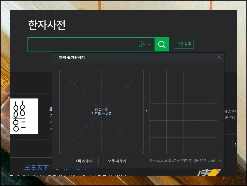 거기에 궁금한 한자를 마우스로 써서 그대로 기입하면 됩니다. 옥편 찾기에 익숙하지 않은 분도 부담 없이 활용할 수 있어요.