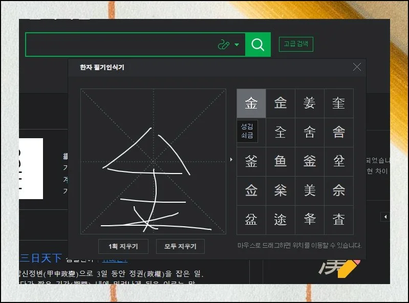 이럴 때 네이버 사전의 한자 써서 찾기 기능을 활용하면 간단히 해결됩니다. 마우스로 모양만 대략 그려 넣으면 비슷한 후보가 바로 나타나서, 복잡한 절차 없이도 원하는 글자를 금방 찾을 수 있어요.