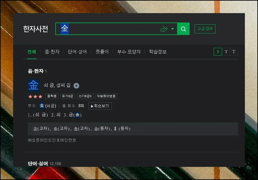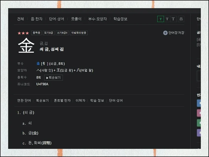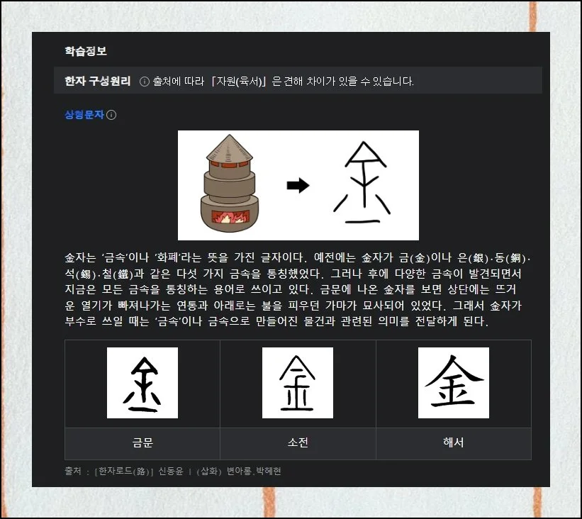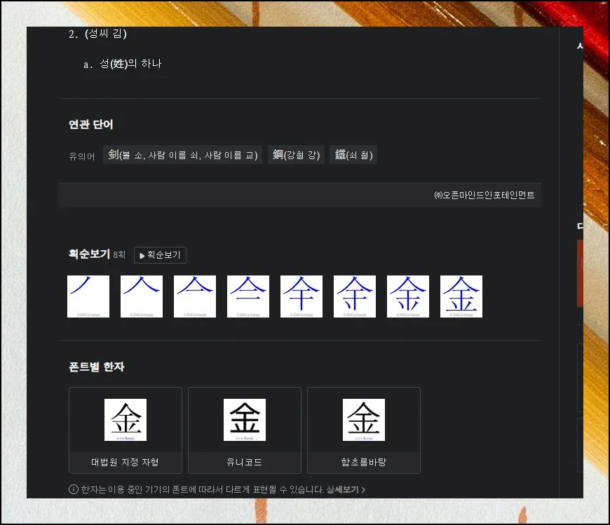 흔한 성으로 쓰이기도 하고 쇠를 가리키기도 하는 금이라 읽히는 한자의 상세 내역이 펼쳐집니다. 써서 찾기했을 뿐인데 놀라울 만큼 충실한 내용을 얻게 돼요.