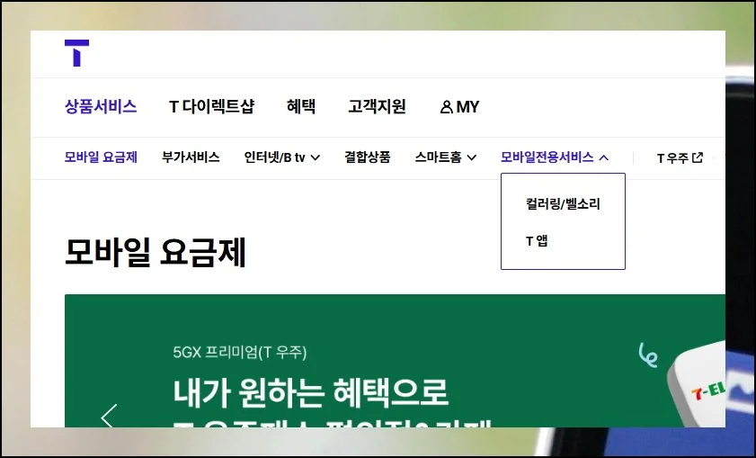 홈페이지에 들어가셨다면 컬러링 메뉴를 찾아야 해요. 보통 상품 서비스모바일 서비스 항목 하위에 위치해 있습니다.