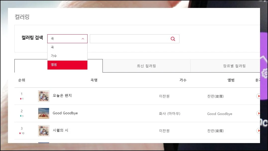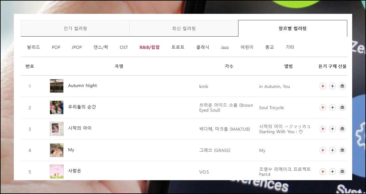 선호하는 장르가 있으신가요. 장르별 차트를 확인해 보시는 것도 좋습니다.