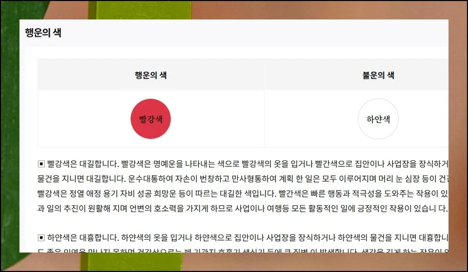 행운의 색상과 피해야 할 색을 명확히 구분해서 알려줍니다. 붉은색처럼 의미 있는 컬러를 옷이나 소품에 활용해보세요.