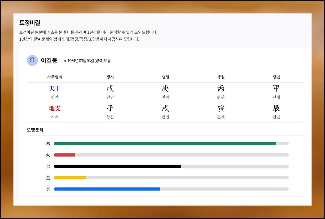 결과 페이지에서는 사주명식과 오행 정보가 가장 먼저 나타나요. 토정비결 해석의 기본이 되는 핵심 요소이니 놓치지 말고 체크하세요.