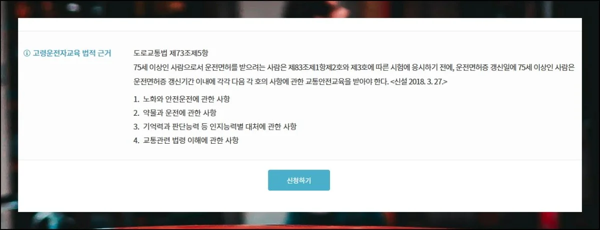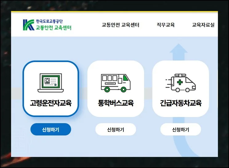 교통안전 교육센터 웹사이트에 접속해주세요. 메인 화면에 고령운전자 대상 교육 서비스 신청 메뉴가 보일 거예요.