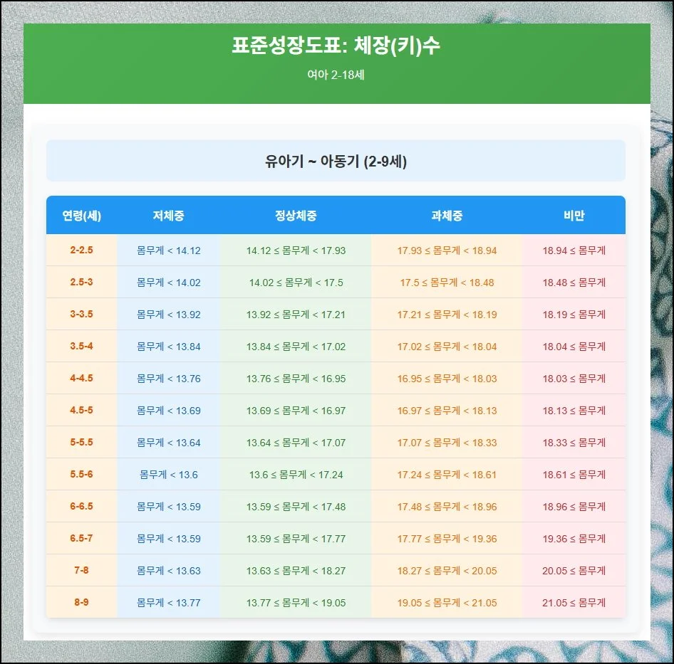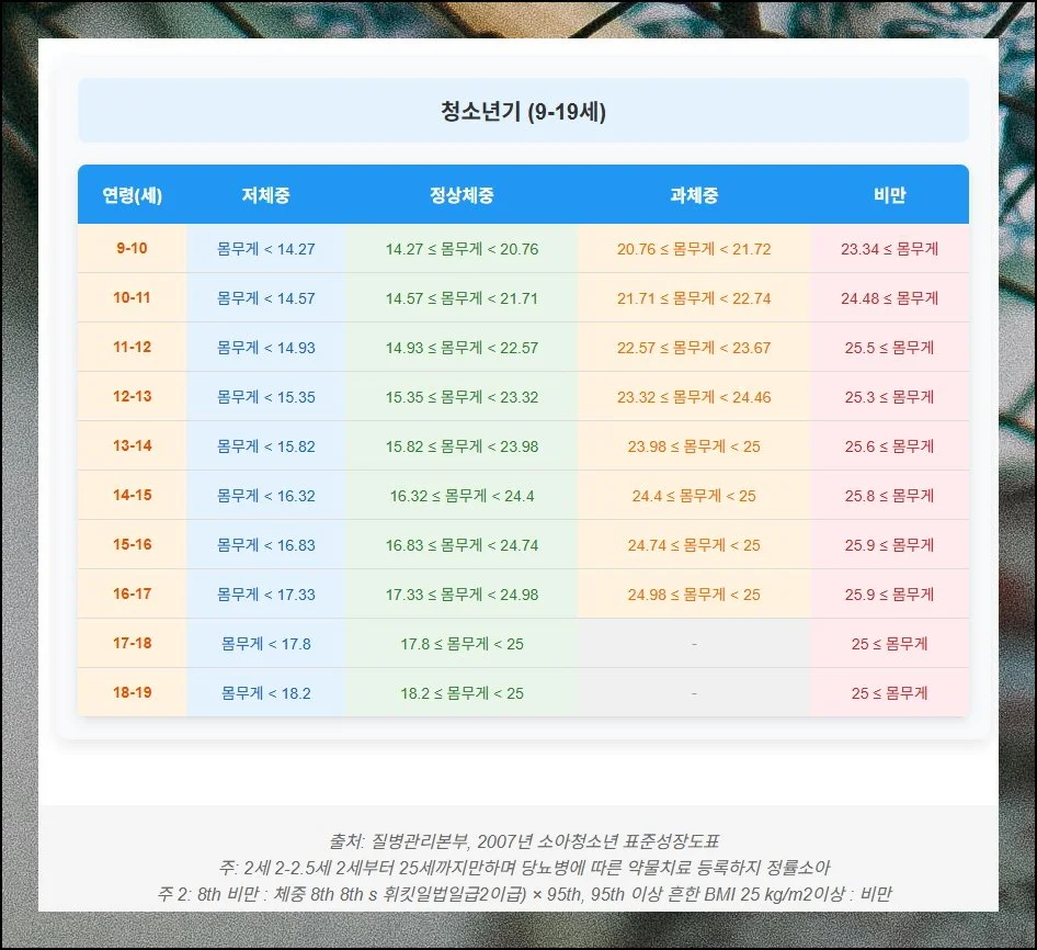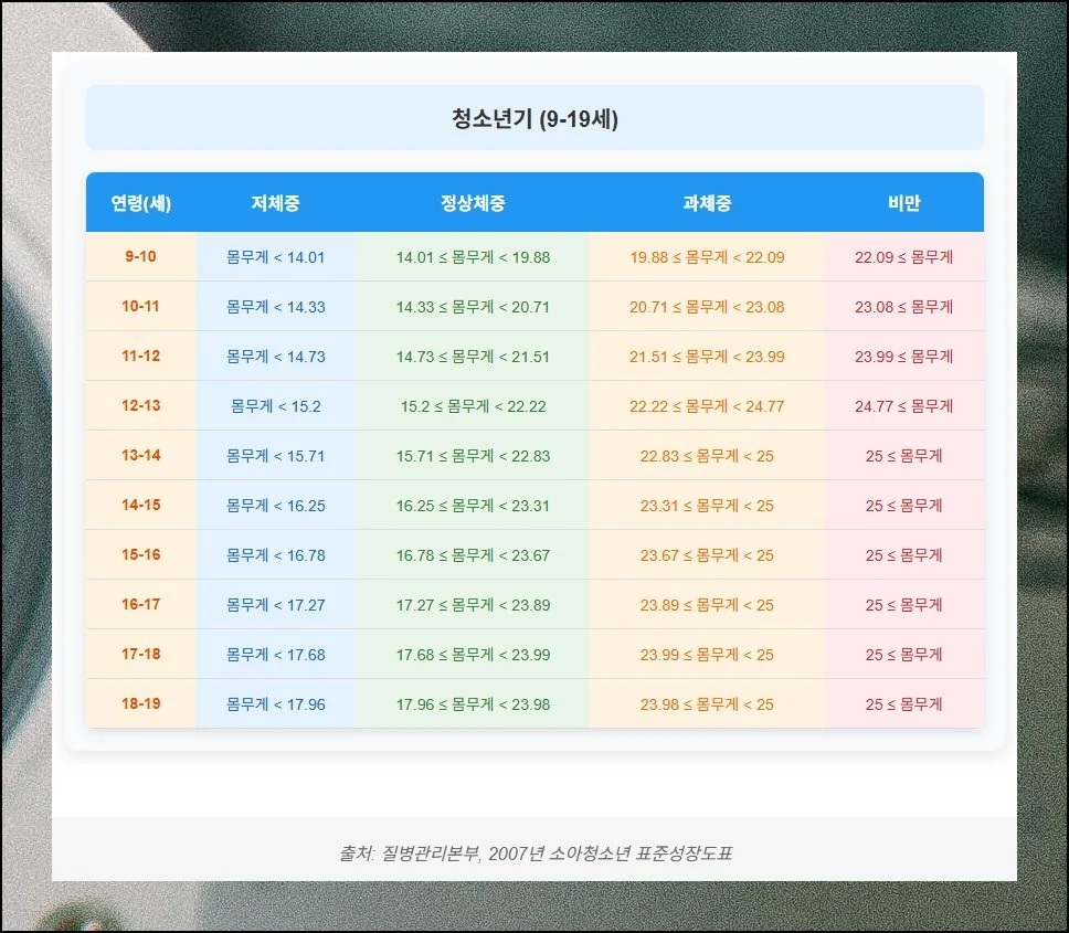 동일한 체질량지수 수치라도 나이대에 따라 저체중, 정상, 과체중 판정이 다르게 나올 수 있습니다.