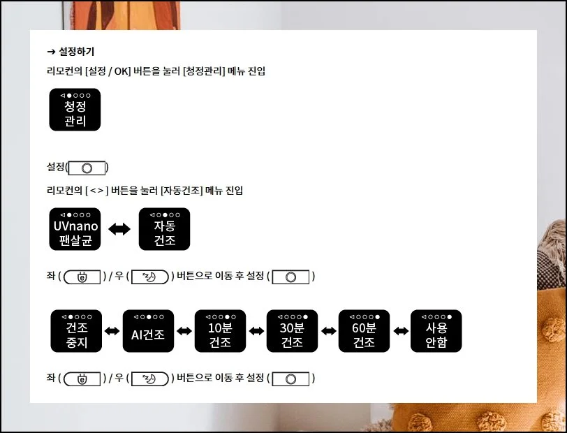 버튼을 여러 번 눌러서 건조 모드로 전환해야 하고, 기능을 켜거나 끄려면 별도의 해제 버튼을 활용해야 해요.